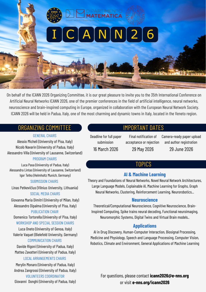 On behalf of the ICANN 2026 Organizing Committee, it is our great pleasure to invite you to the 35th International Conference on Artificial Neural Networks ICANN 2026, one of the premier conferences in the field of artificial intelligence, neural networks, neuroscience and brain-inspired computing in Europe, organized in collaboration with the European Neural Network Society (ENNS). ICANN 2026 will be held in Padua, Italy, one of the most charming and dynamic towns in Italy. It is located in the Veneto region, in Northern Italy. The historical center boasts a wealth of medieval, renaissance and modern architecture. Here a fascinating mix of historic and new, of centuries-old traditions and metropolitan rhythms creates a unique atmosphere. The medieval palaces, churches and cobbled streets emanate a sense of history. Padua features rich historical and cultural attractions, such as “Prato della Valle”, the largest square in Europe; the famous Scrovegni Chapel painted by Giotto; the Botanical Garden that is a UNESCO World Heritage; the University of Padua, that is the second oldest university in Italy (1222) with more than 800 years of history.